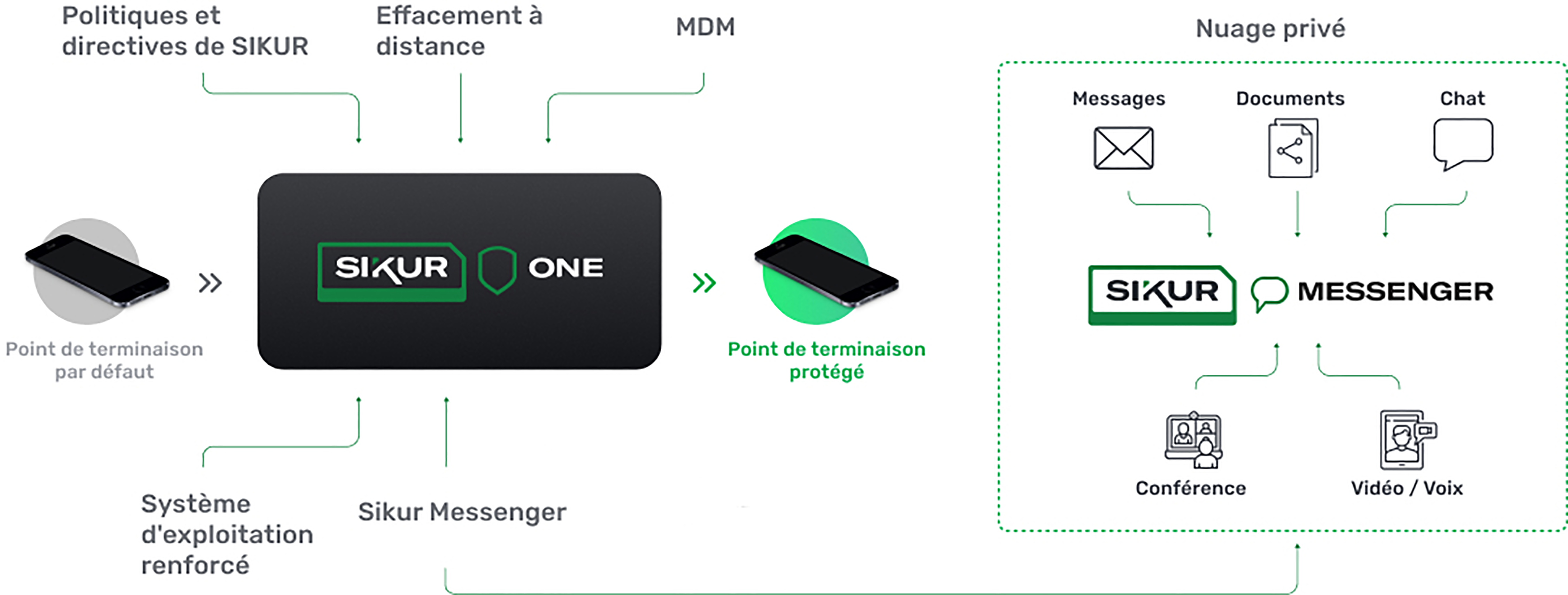 La plate-forme se compose de l’application Sikur Messenger et/ou d’un smartphone (comprenant un ensemble de logiciels, de politiques et de directives de sécurité), certifiés en usine par les ingénieurs de Sikur, conformément aux directives de sécurité les plus modernes. Contrairement à un appareil commun qui, par défaut, est ouvert et facile à modifier ses paramètres, ce qui peut permettre l’introduction d’artefacts malveillants, ouvrant des portes à la fuite de données et à l’espionnage, Sikur One est prêt à atténuer ces menaces.